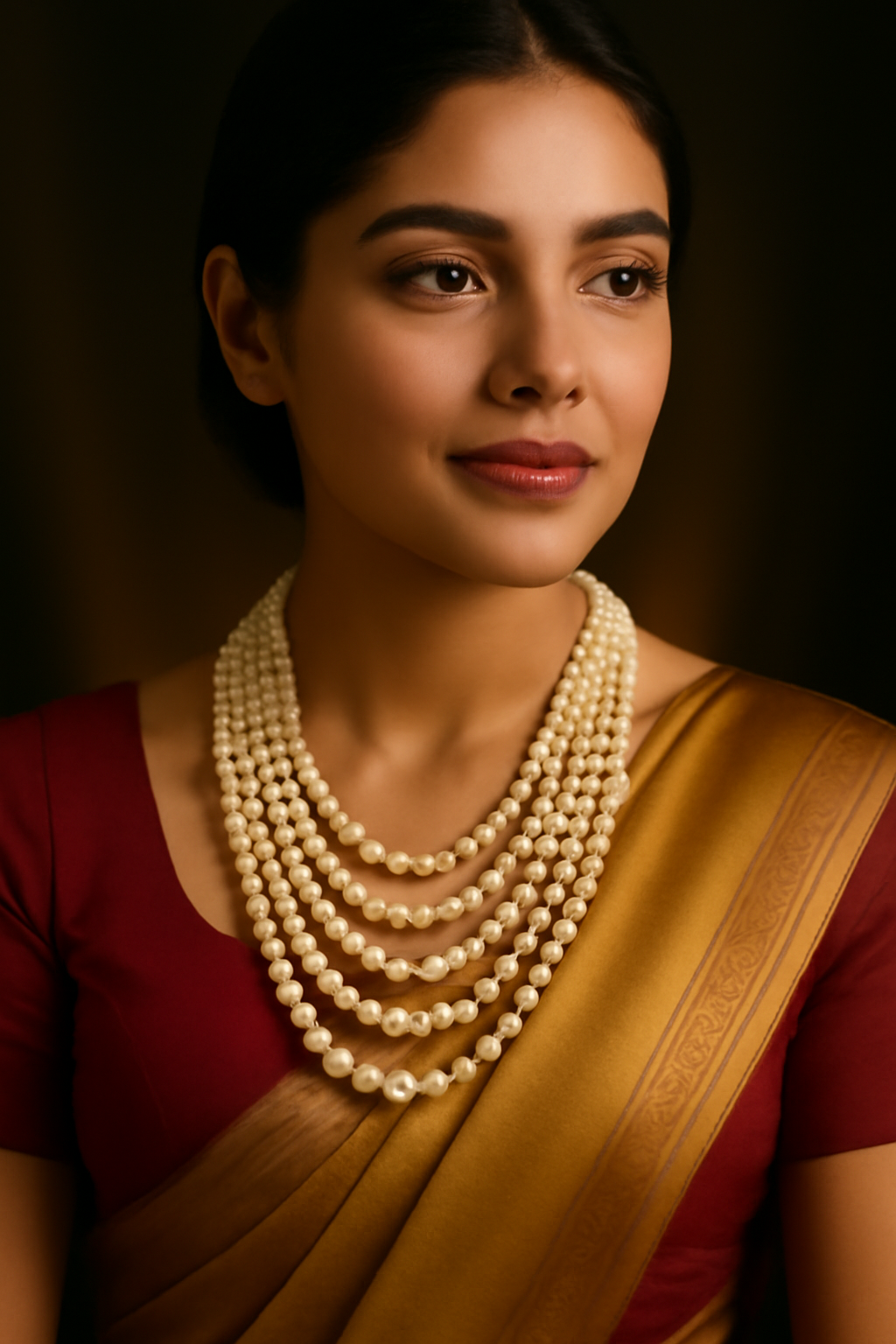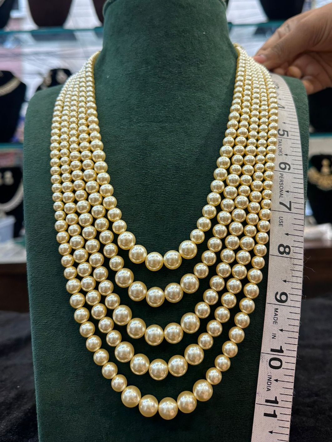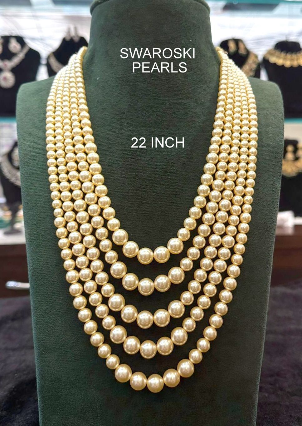 This BEADS MALA AND CHAINS features 5 lines of Swarovski pearls, making it a hot seller for both gents and ladies. The cream-colored pearls add a touch of elegance, perfect for graduation and other special occasions. Experience the luxury and beauty of Swarovski pearls with this stunning mala and chain set.
