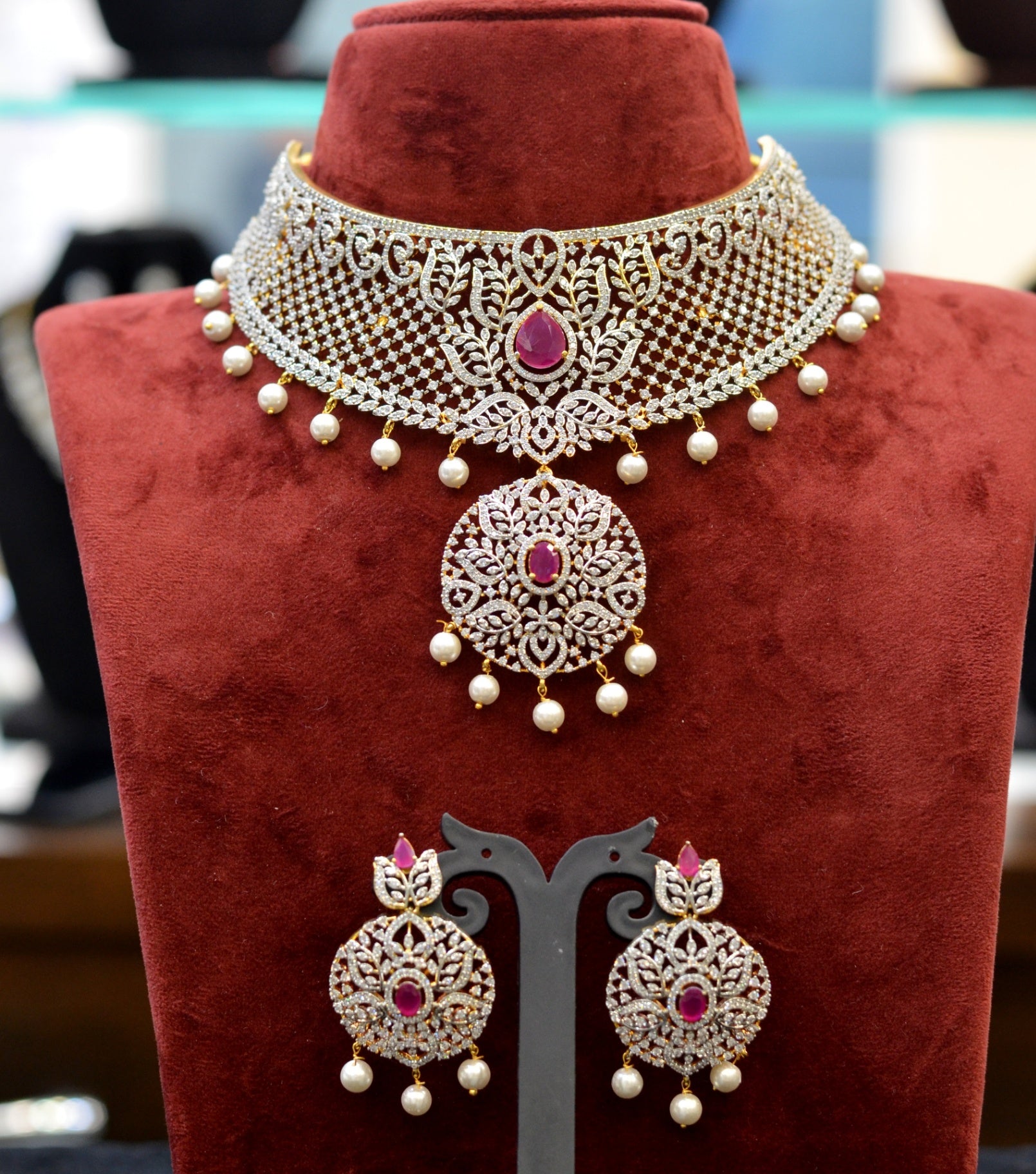 This elegant locket-style choker features a stunning combination of diamond polish, vibrant ruby stones, and delicate pearl drops. Paired with comfortable screwback earrings, this set offers both beauty and ease of wear. Perfect for adding a touch of sophistication to any outfit.
