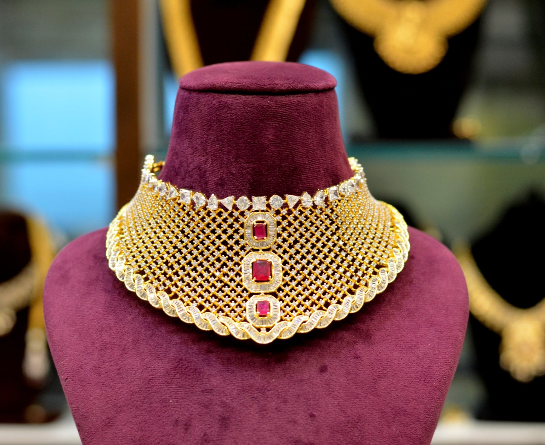 These premium screwback earrings showcase large Swarovski crystals and high-quality cubic zirconia stones, accented with rich ruby gems. Designed for bridal wear, their substantial size and secure fastening provide both elegance and comfort. A hot seller known for exceptional craftsmanship, these earrings add a striking, sophisticated touch to any special occasion ensemble.