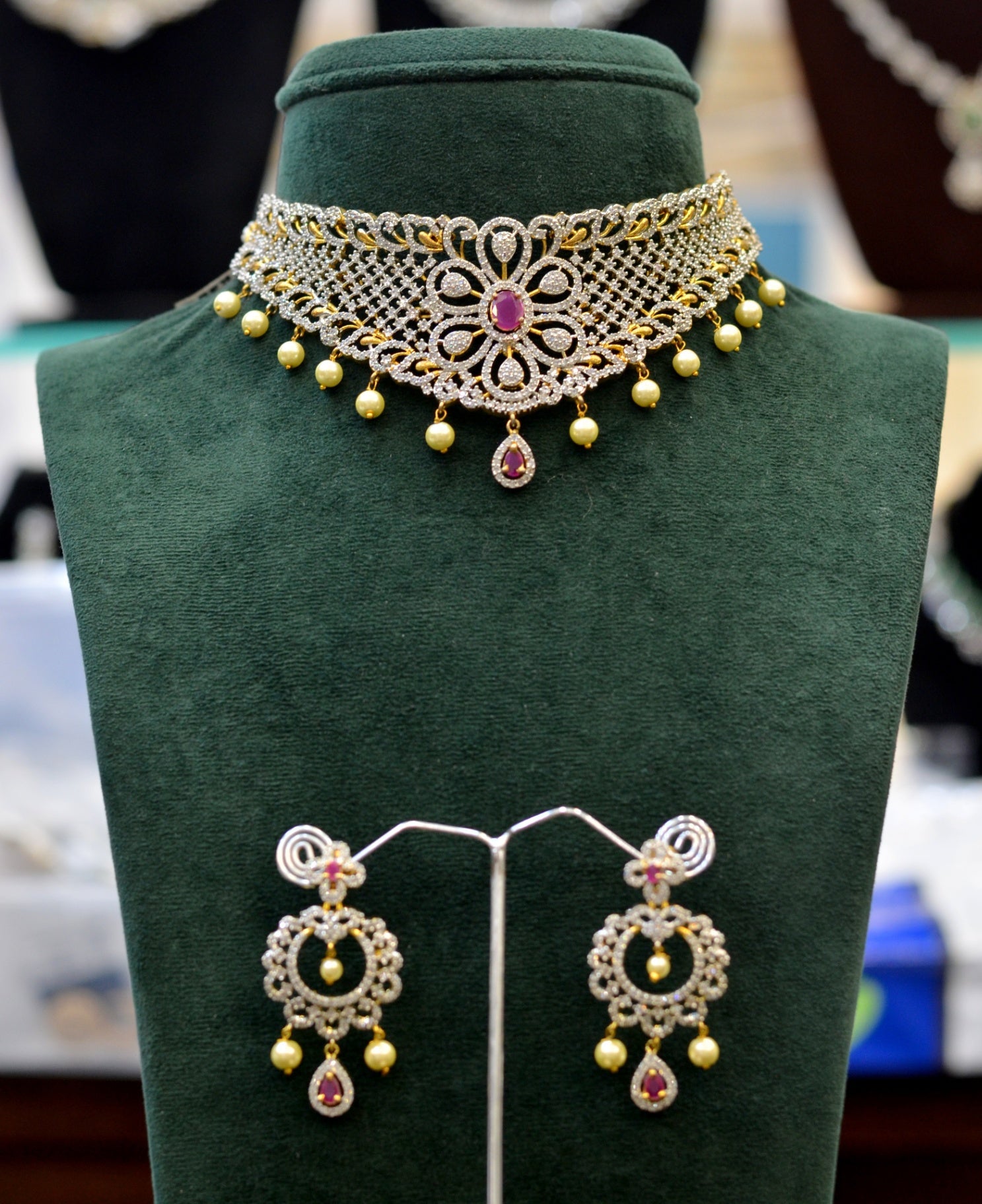 This exquisite choker showcases a delicate flower motif, expertly crafted with diamond and golden polish to create a small yet striking piece. The elegant design is enhanced by vibrant ruby accents, offering a timeless accessory that combines simplicity with refined beauty. Ideal for adding a subtle floral charm to any outfit.