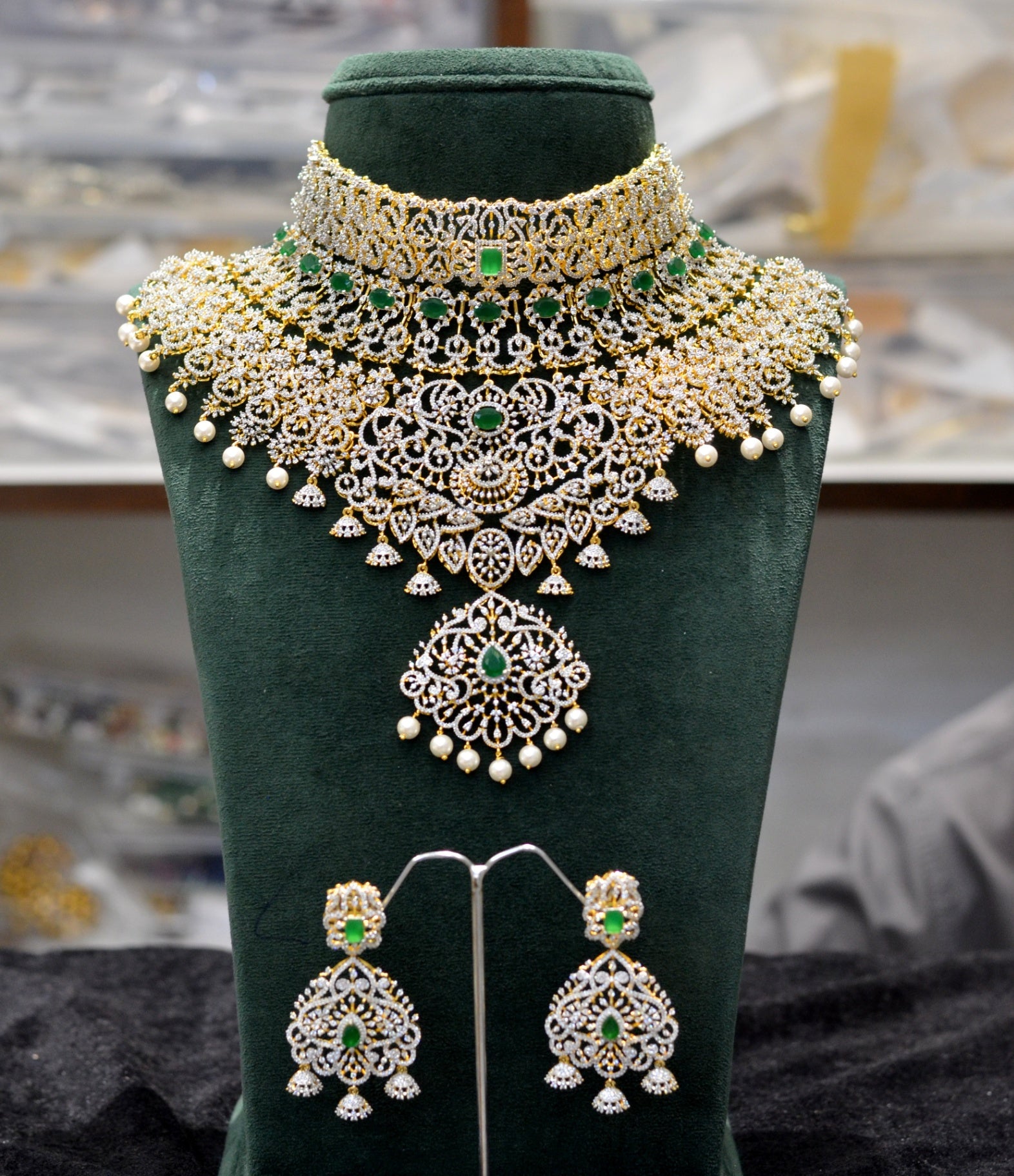 Experience the luxury of our CHOKER Choker 085 DIAMOND EMERALD, a one-of-a-kind piece with a diamond look and premium CZ stone. Its heavy bridal choker in a beautiful green color, complete with big danglers earrings, will elevate your wedding look. This exclusive design is crafted with the highest quality for a truly special experience.