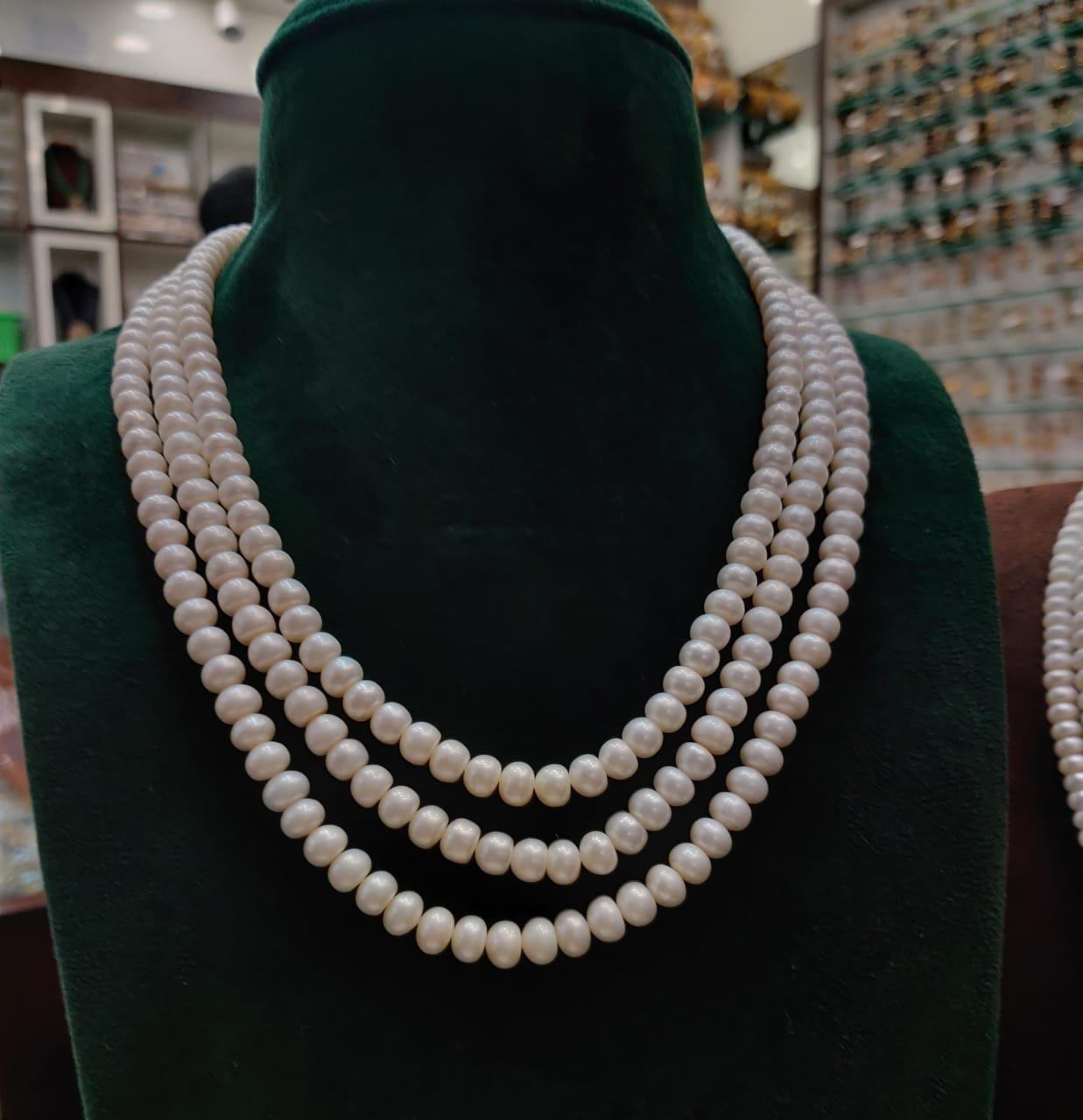 This elegant 20-inch natural white pearl necklace features a flat-shaped, three-line design that adds depth and sophistication to any outfit. Secured with a convenient back hook, it combines style with ease of wear. A hot seller for its timeless appeal and quality craftsmanship, this piece is perfect for enhancing your jewelry collection.