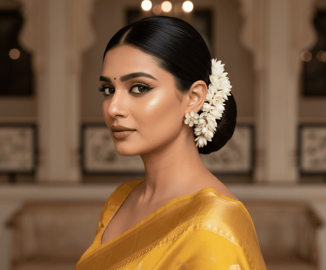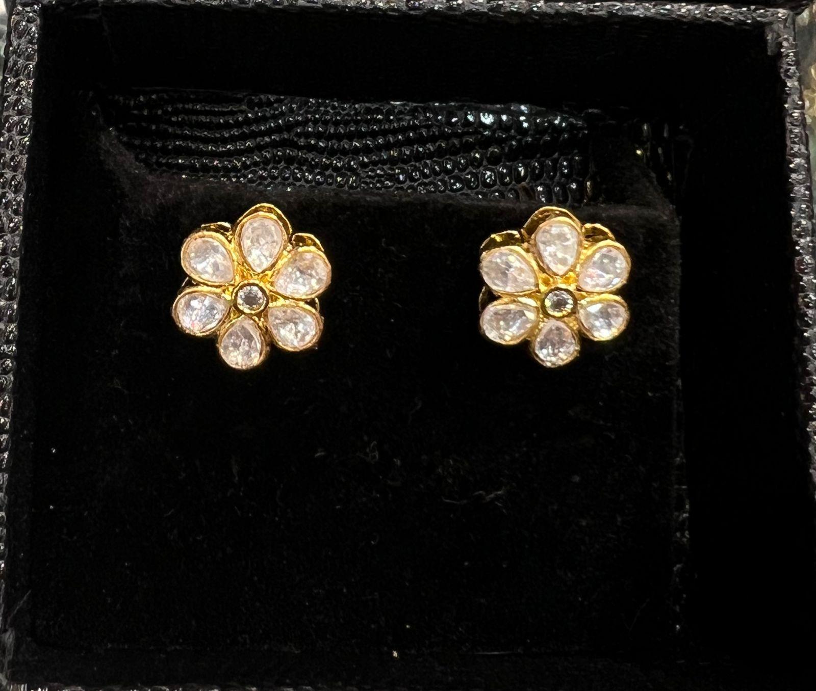 These Earring Eartops 101 feature a beautifully crafted floral design and a stunning Mozonite look stone with a glossy golden polish. Made with the utmost quality, these earrings offer a comfortable push back style. Elevate any outfit with these elegant and timeless eartops.