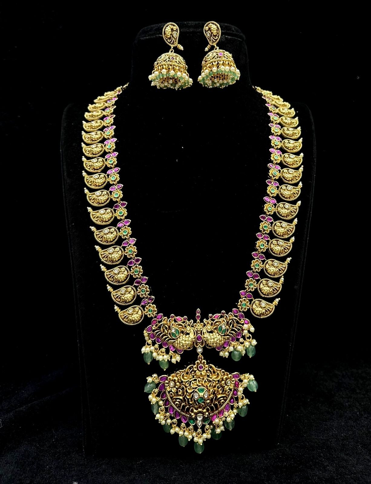 Introducing GUTTAPUSAL's latest hot seller, the Guttapusalu 026 EMERALD Long necklace. Adorned with exquisite Nakshi work and a premium quality mango design, this necklace boasts a stunning Nakshi Jhumka for a touch of true elegance. Perfect for those seeking a luxurious, Jadau look.