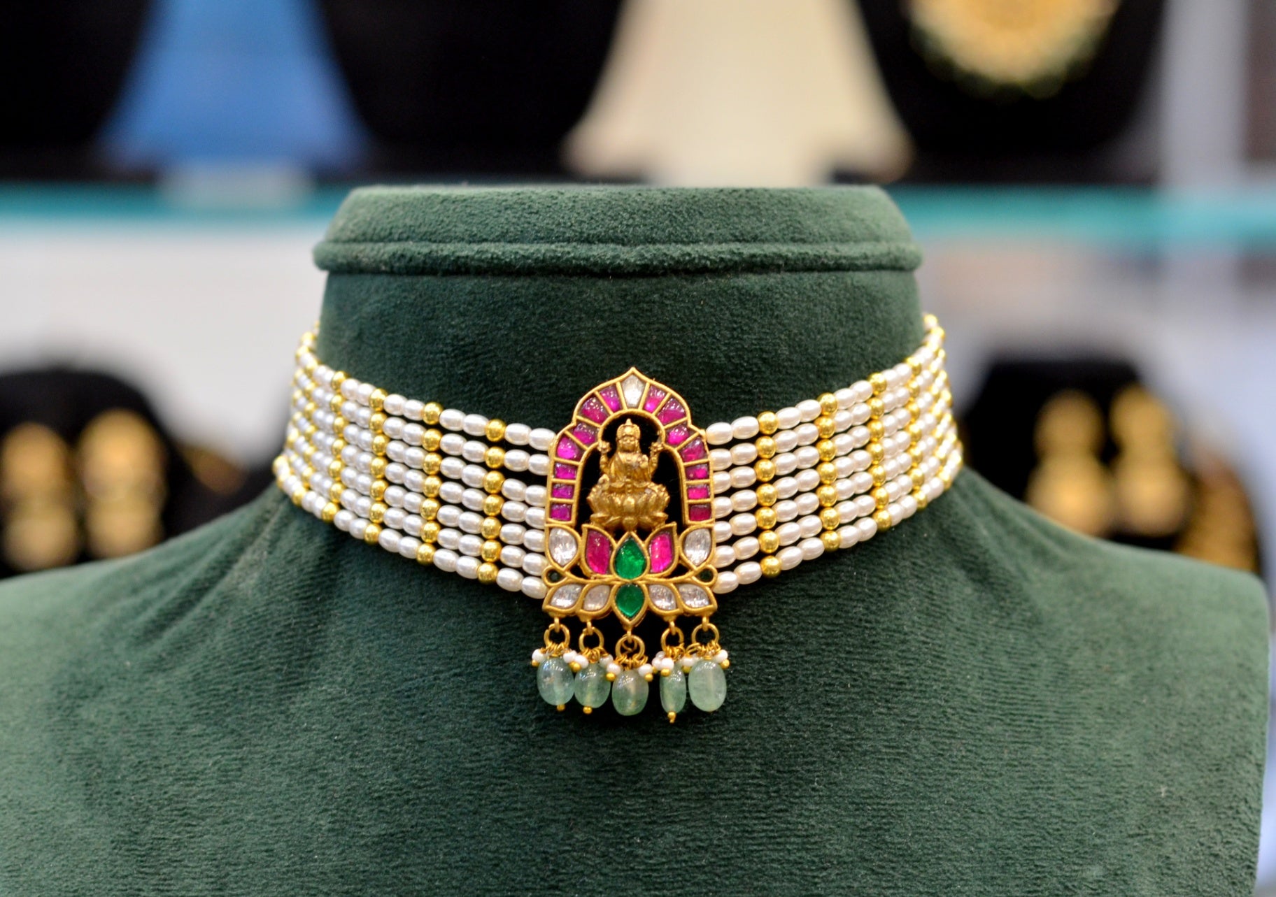 This mini choker features a gold polish and stunning laxmi devi design, perfect for those seeking a bold, premium look. Adorned with Jadau look stones, it's a hot seller that exudes elegance and luxury. Elevate any outfit with this high-quality, must-have accessory.