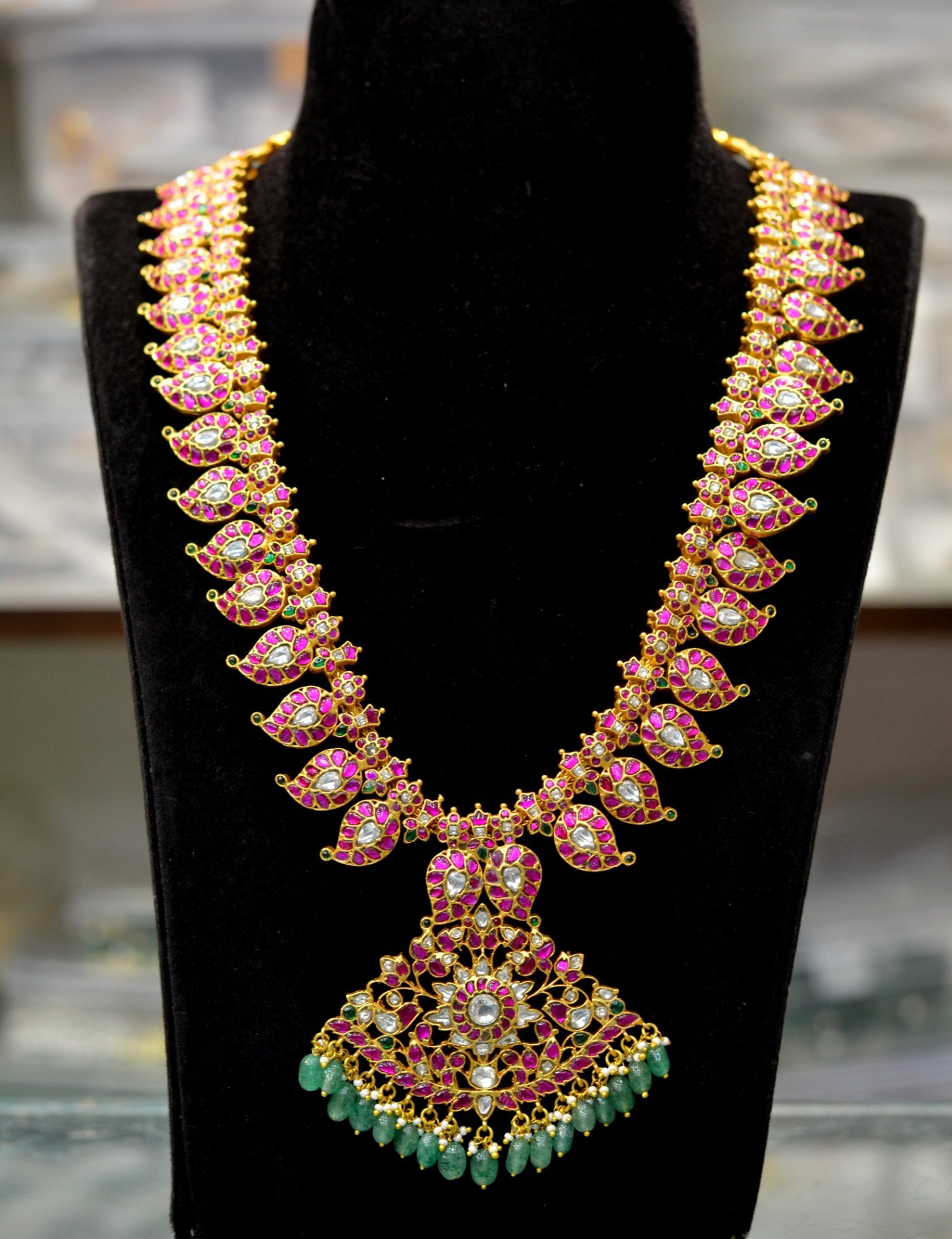 Introducing our stunning Jadau Mango Necklace from our premium wedding collection. This necklace showcases a traditional South Indian mango design adorned with high-quality Jadau stone. A must-have for the modern bride with its latest design and exquisite craftsmanship.