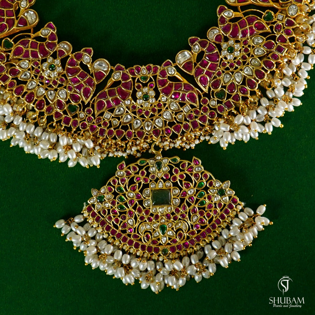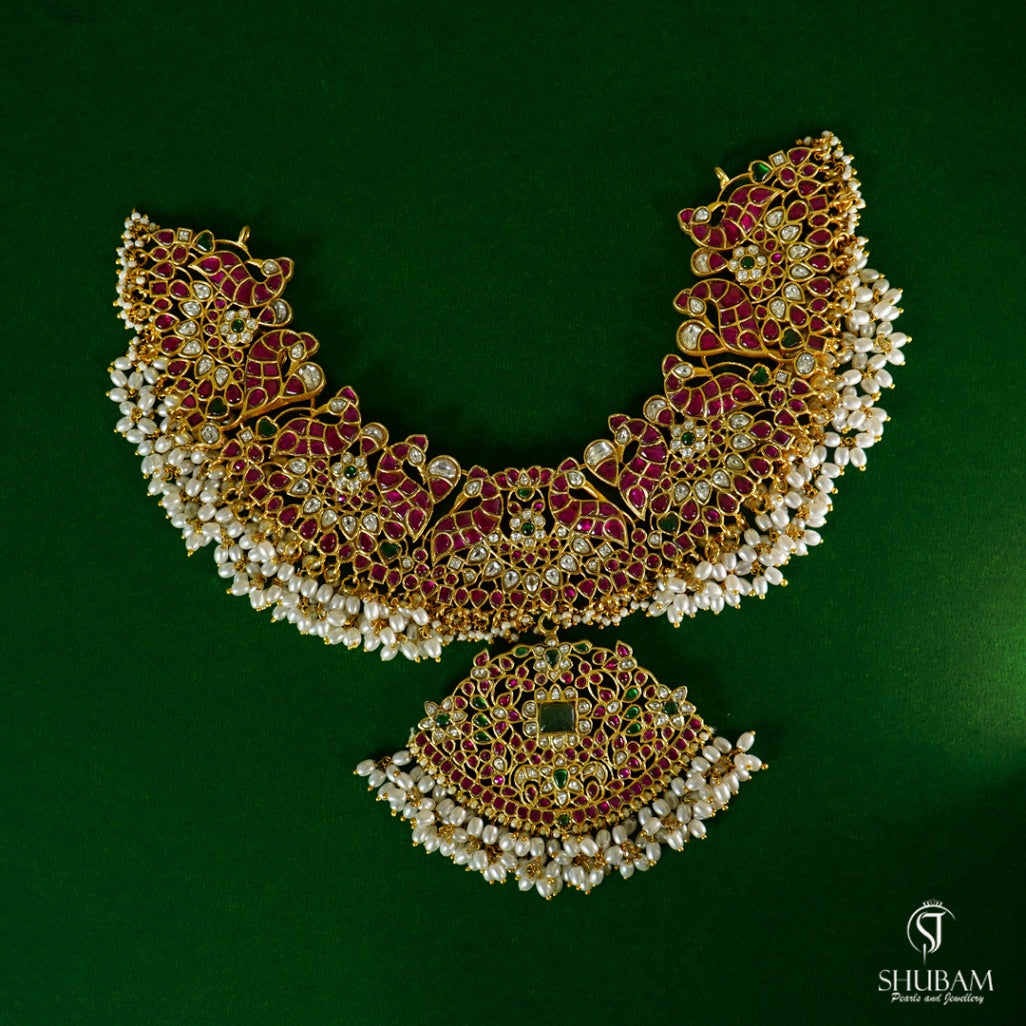 This exquisite Jadau necklace features a multi-color stone arrangement crafted in the traditional Guttapusal style. Its short set design, enhanced with a rich golden polish, offers a timeless elegance perfect for special occasions. Expertly made, it combines vibrant hues and intricate craftsmanship to elevate your jewelry collection.