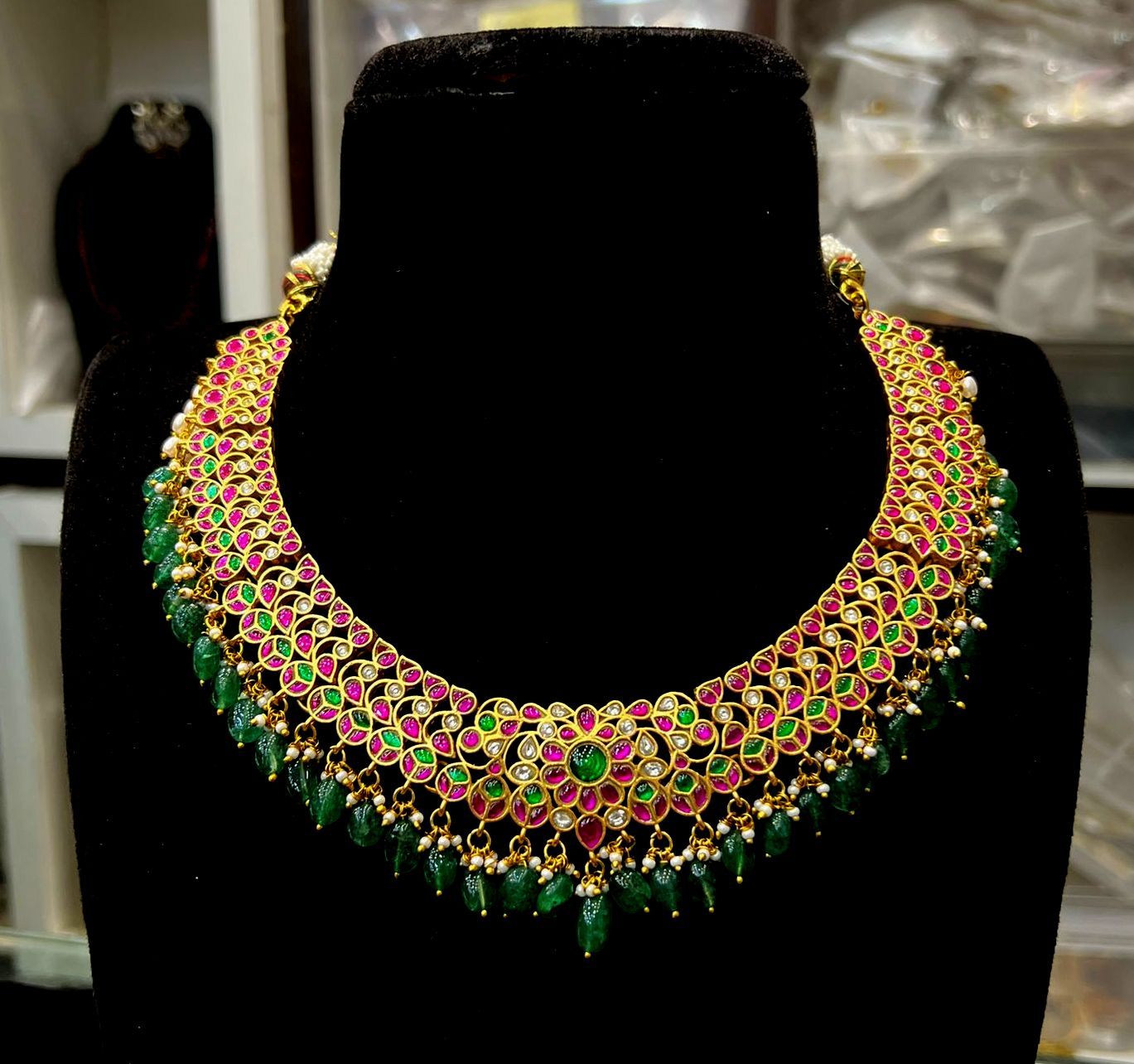 Unleash the beauty of tradition with our JADAU necklace 175. Featuring a stunning golden polish and adorned with multi-colored Jadau stones and green strawberry drops, this short set is sure to elevate any outfit. Don't miss out on our unique new design.