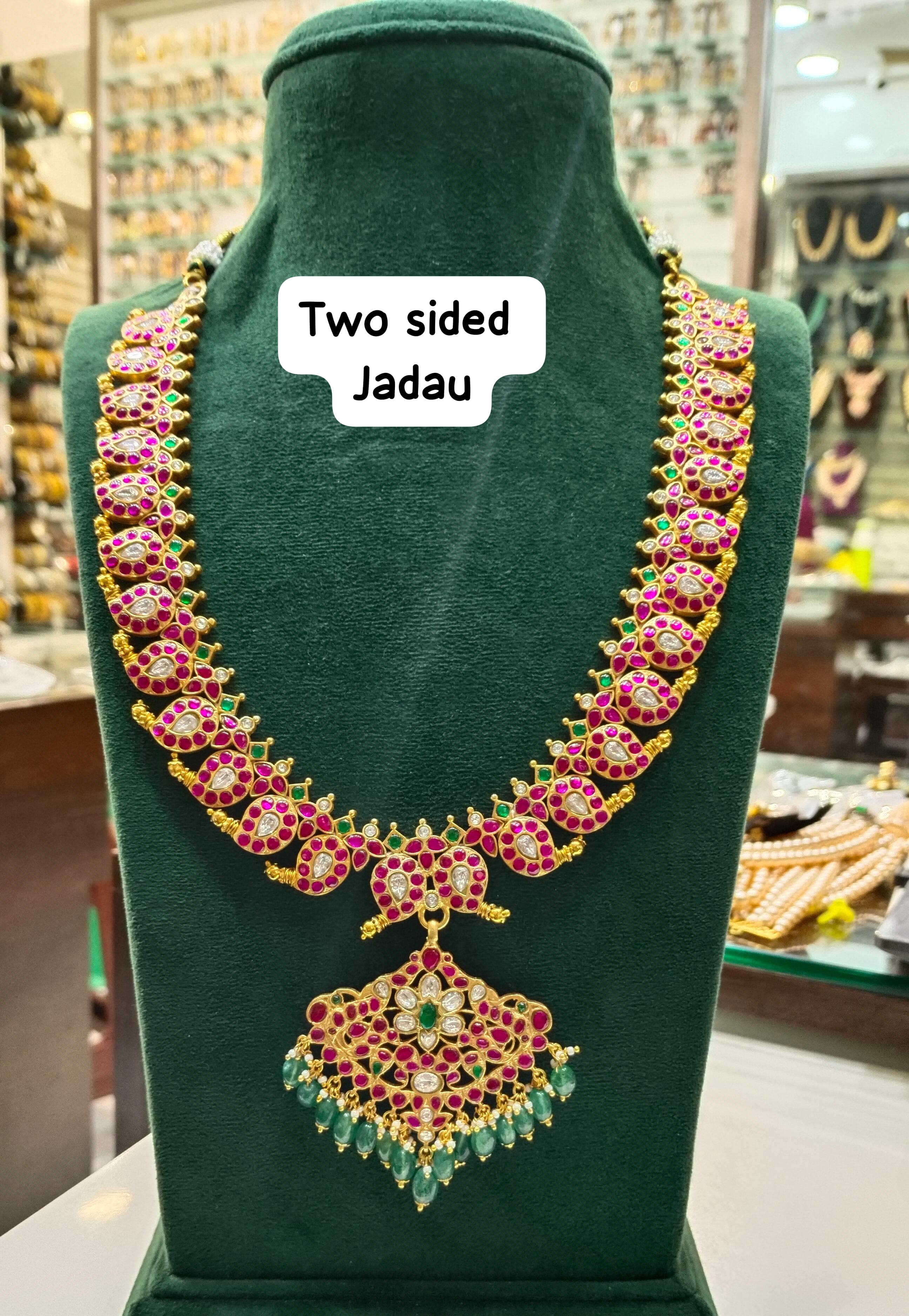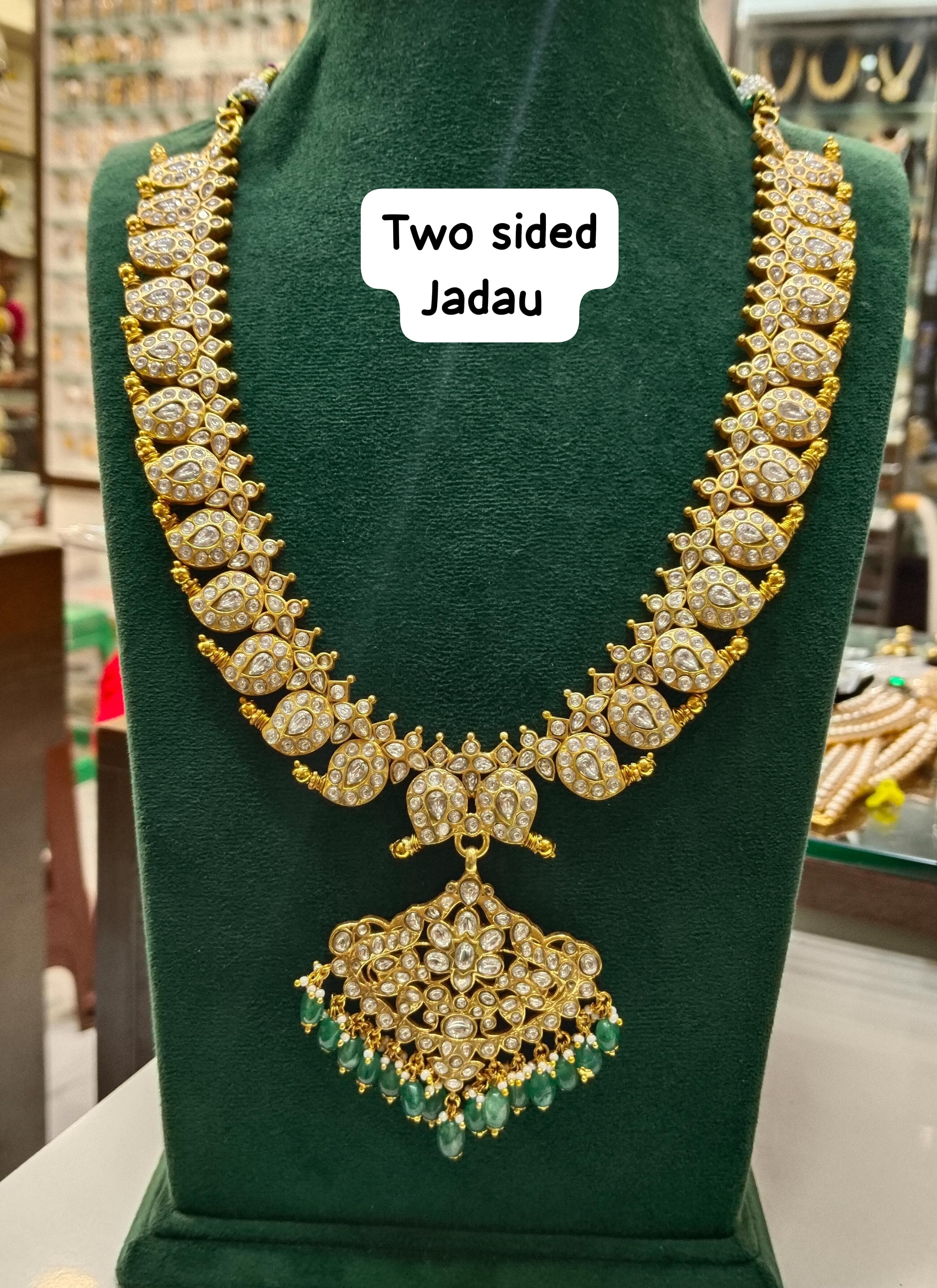 Discover the beauty and versatility of the JADAU REVERSIABLE MANGO NECKLACE JADAU MULTI COLOR. Featuring a trendy two-sided design, this necklace showcases intricate jadau work and real natural bead drops. Perfect for both bridal and everyday wear, this necklace is a must-have for any jewelry collection.