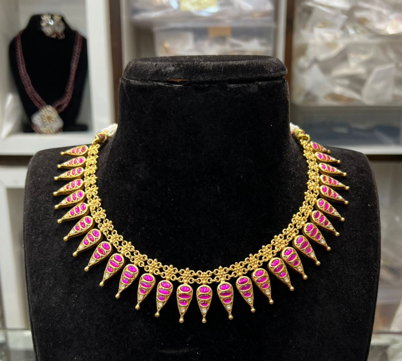 Expertly crafted with two sided and reversible Jadau stones, this necklace is the perfect blend of trendiness and traditional elegance. Its golden polish and brass alloy base make it a must-have for any fashion-forward individual. Don't miss out on the most popular and latest short set in jewelry!