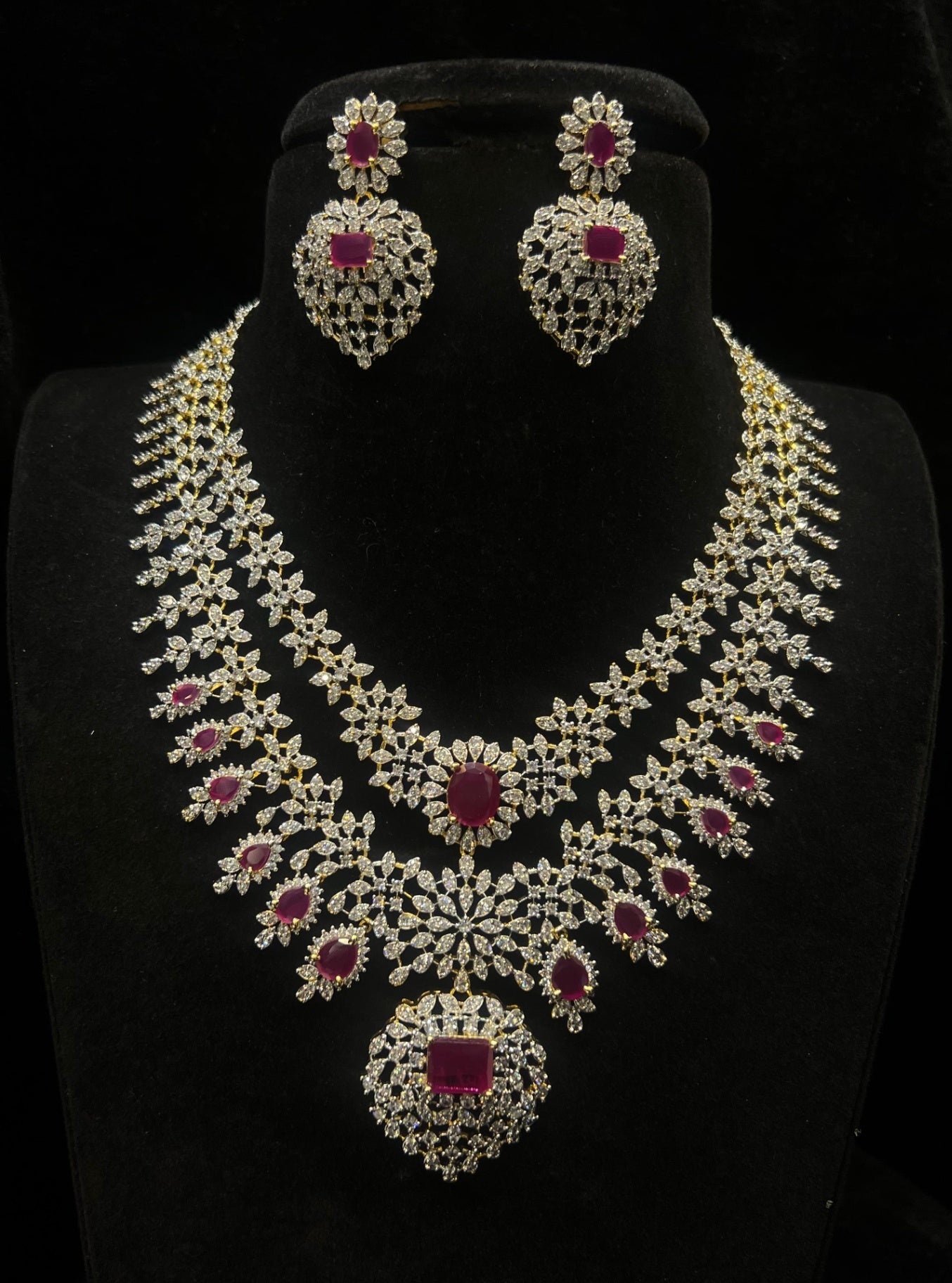 This premium quality South Indian style necklace features a beautiful red center stone surrounded by sparkling Cz stones. With its 2 layers and screwback fastening, this diamond look necklace is both trendy and elegant. Perfect for adding a touch of glamour to any outfit.