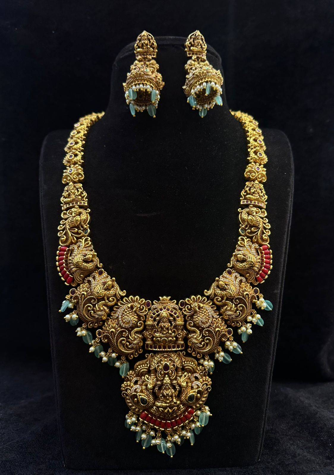 This exquisite long necklace features intricate Nakshi work paired with antique gold plating, embodying traditional elegance. The mint green accents add a subtle yet refreshing touch, making it perfect for special occasions. Complemented by matching screw earrings, this set offers both style and comfort for a timeless look.