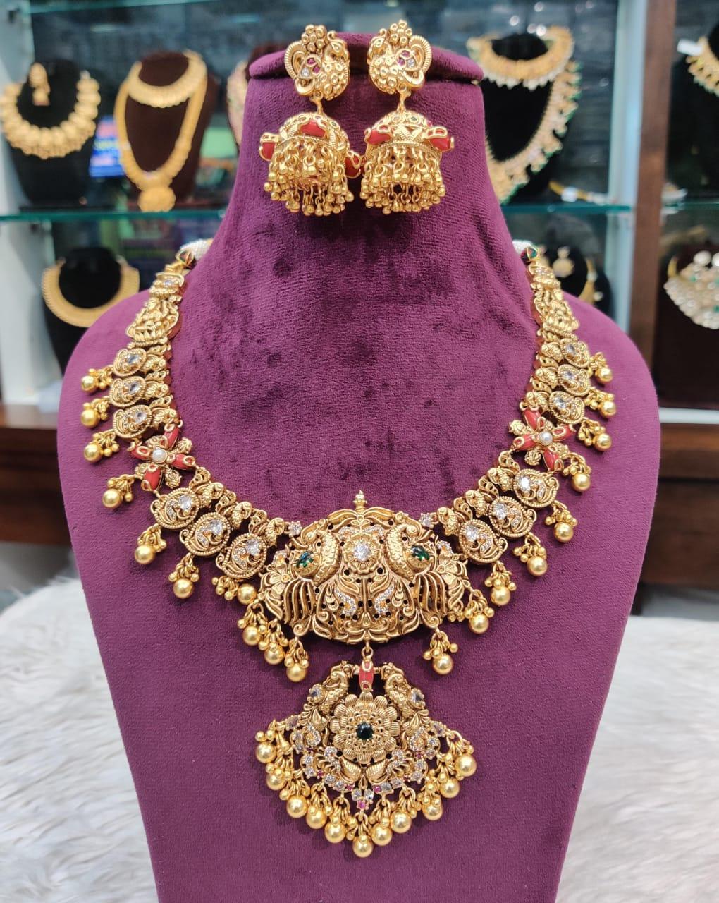 Indulge in luxury with our NECKLACE 004 NAKSHI AD STONE GOLDEN. This timeless piece features a trendy mango design with a peacock motif, expertly crafted from antique plated metal. Traditional yet modern, it also boasts a delicate Jhumka charm. Elevate any outfit with this elegant and exclusive necklace.