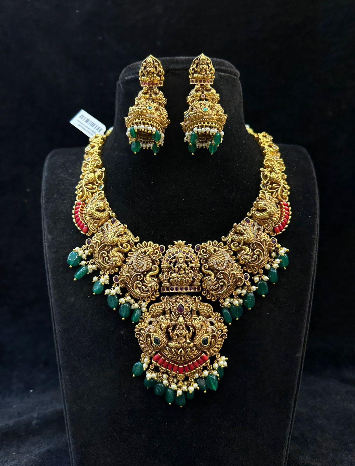 This antique gold plated necklace showcases intricate Nakshi work, adorned with coral stones and light green drops. Its short length makes it a versatile piece for everyday wear, and its temple jewellery design adds a touch of elegance to any outfit. Elevate your style with this unique and timeless necklace.