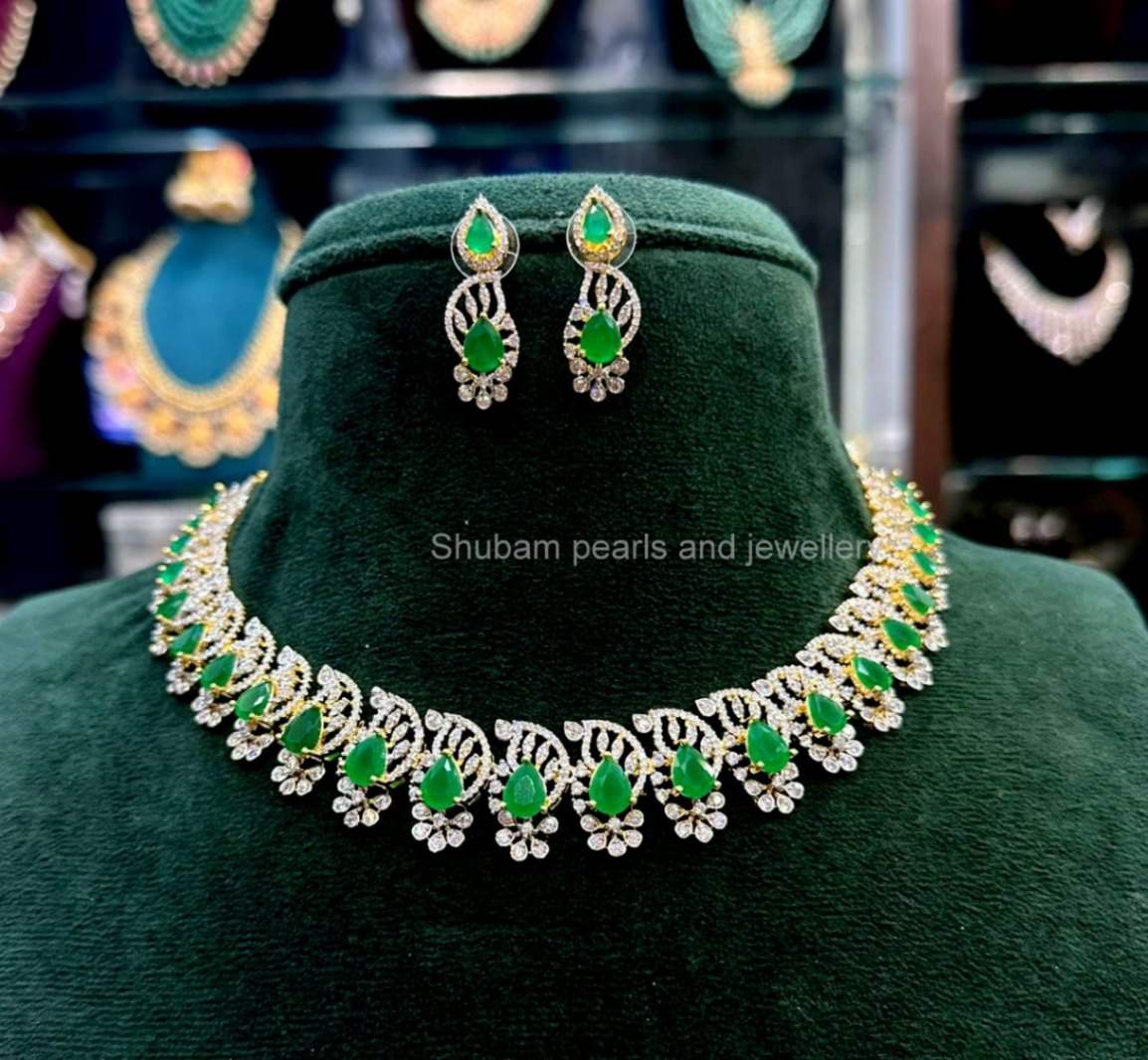 This premium NECKLACE necklace features a stunning diamond look and elegant cz stones, creating a chic and sophisticated appearance. The short length and push back earrings make it a convenient and stylish option for daily wear. Its hot selling status and exquisite emerald accent make it a must-have for any occasion
