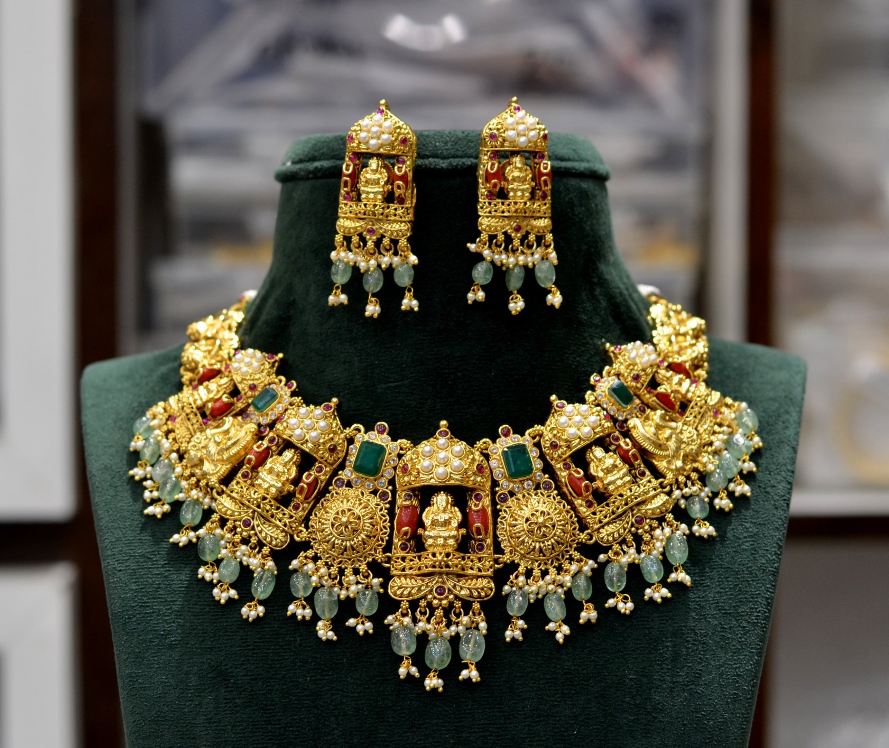 This lightweight necklace features exquisite nakshi work with an antique gold-plated finish, beautifully showcasing a traditional peacock design. Adorned with green drops and coral accents, it reflects a timeless temple-inspired look perfect for bridal wear. Elegant and trending, this piece offers a classic charm while ensuring comfortable wear for special occasions.