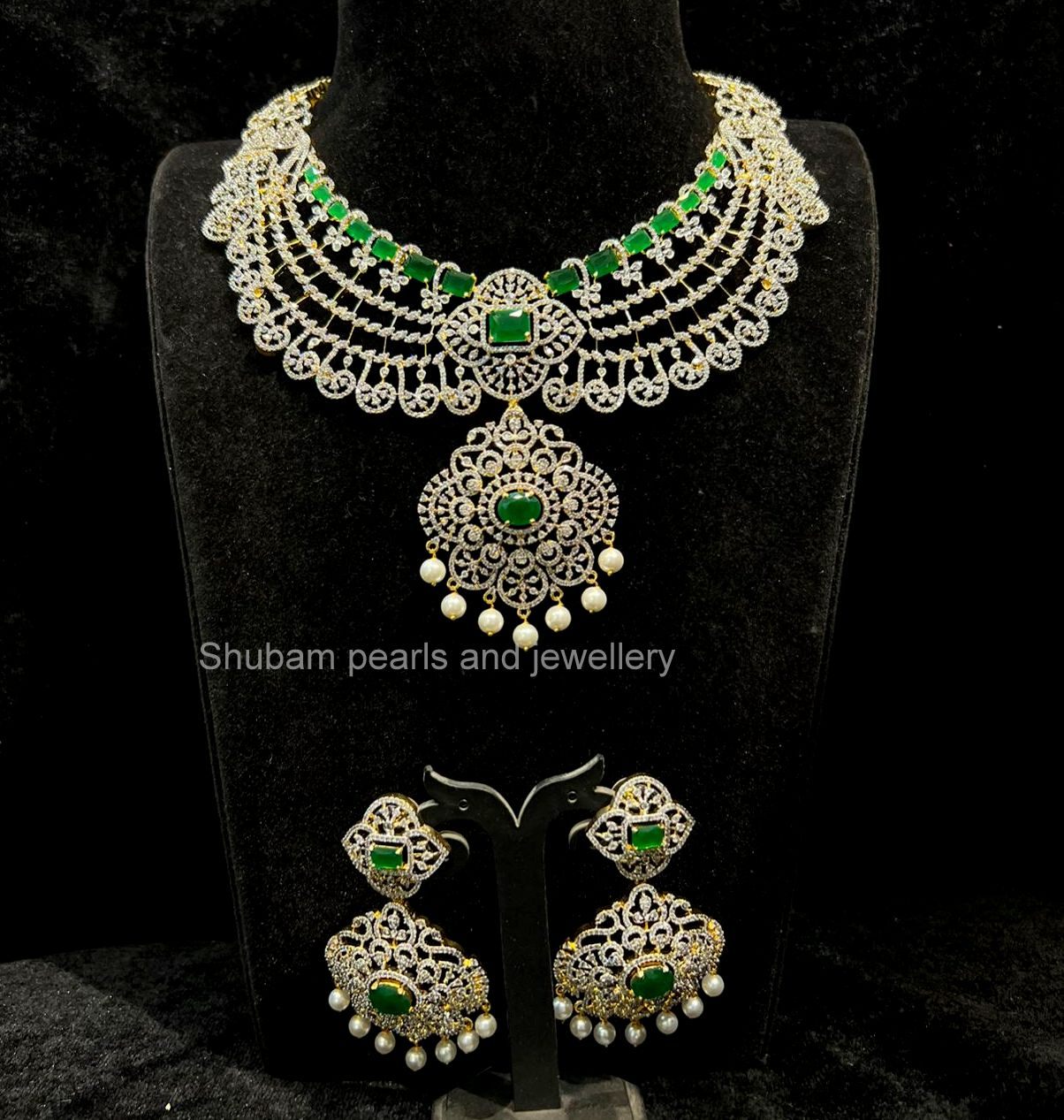 Complete your bridal look with this NECKLACE necklace featuring dazzling diamonds and a stunning emerald pendant. The push back earrings and detachable pendant add versatility to this set, making it perfect for any special occasion. Elevate your style and feel like a true bride with this exclusive piece.
