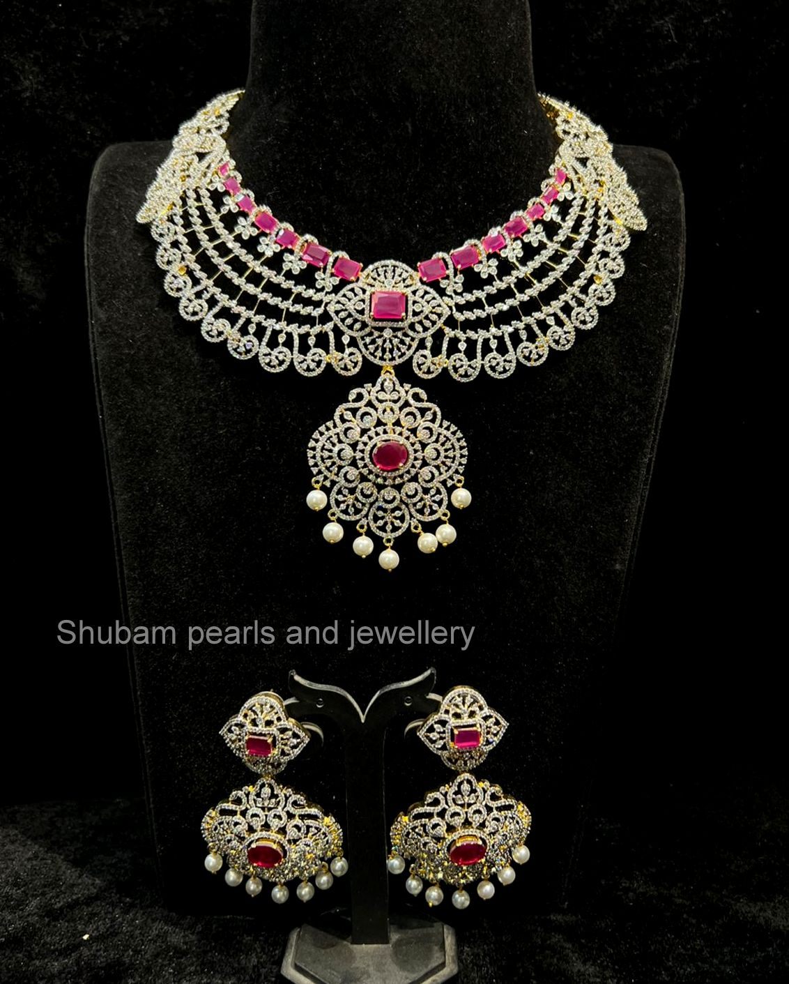 Complete your bridal look with this NECKLACE necklace featuring dazzling diamonds and a stunning ruby pendant. The push back earrings and detachable pendant add versatility to this set, making it perfect for any special occasion. Elevate your style and feel like a true bride with this exclusive piece.