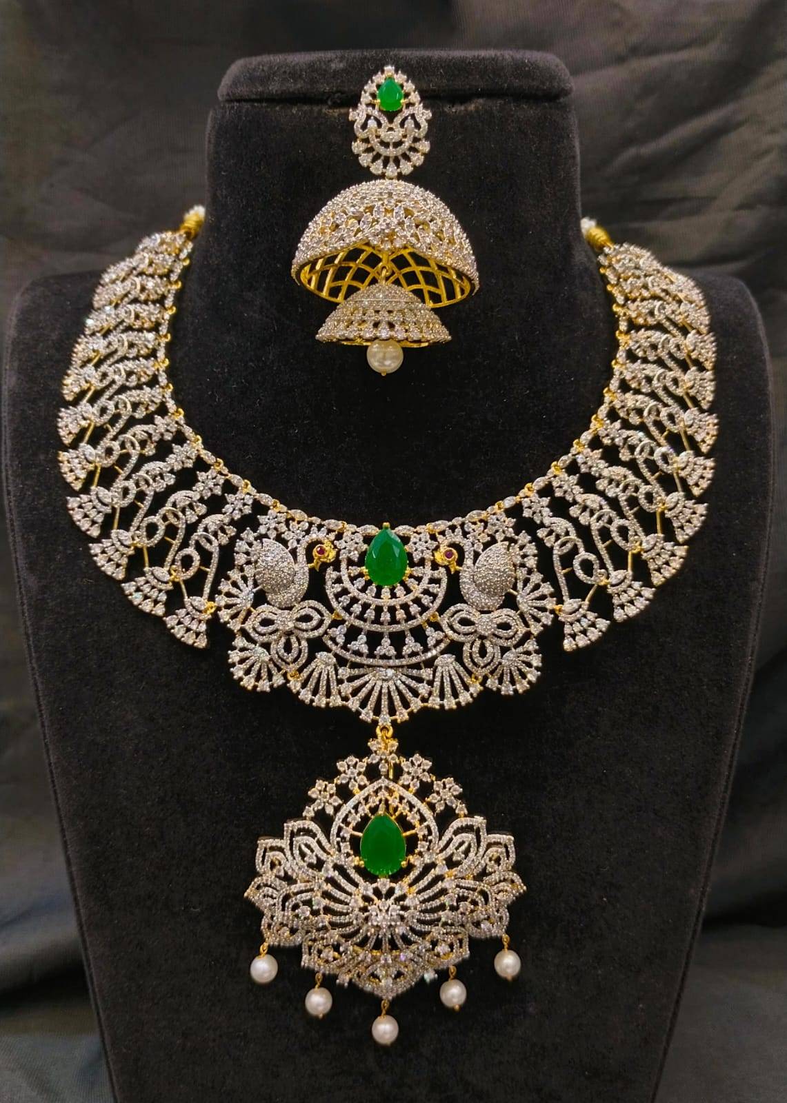 Complete your outfit with our stunning NECKLACE NECKLACE. This elegant piece boasts a beautiful 414 DIAMOND and EMERALD design. With its 2 step bhutta earrings, push back closure, and single heavy haram, you'll feel confident and stylish all day long. Upgrade your jewelry collection with this statement piece.