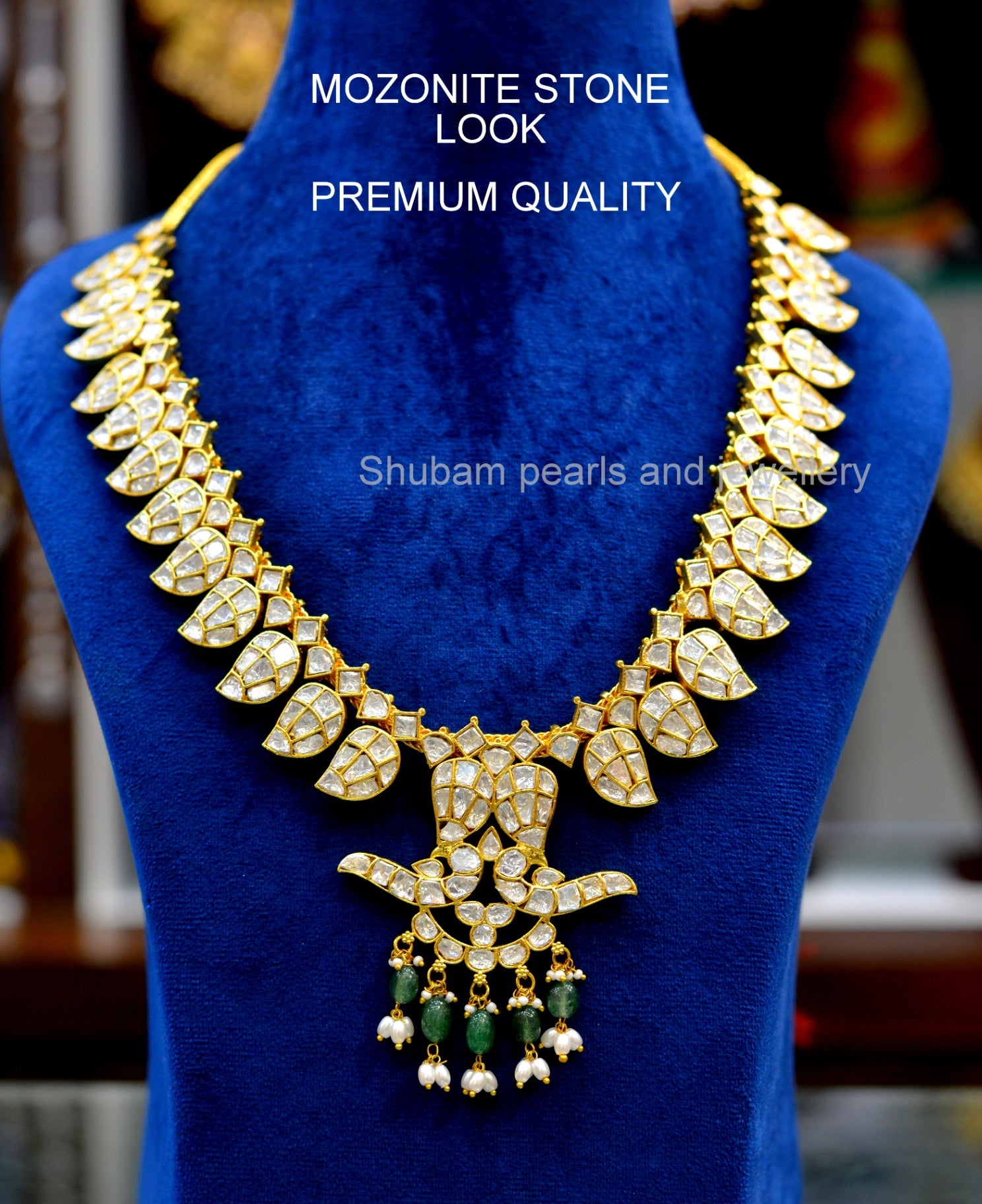 Experience elegance with our premium quality handmade Necklace 606. The exquisite Mozonite look stones add a touch of sophistication while the mango style motif and 22 karat polish make a statement. With a versatile medium length and green drop accents, this necklace is perfect for any occasion. No earrings attached.