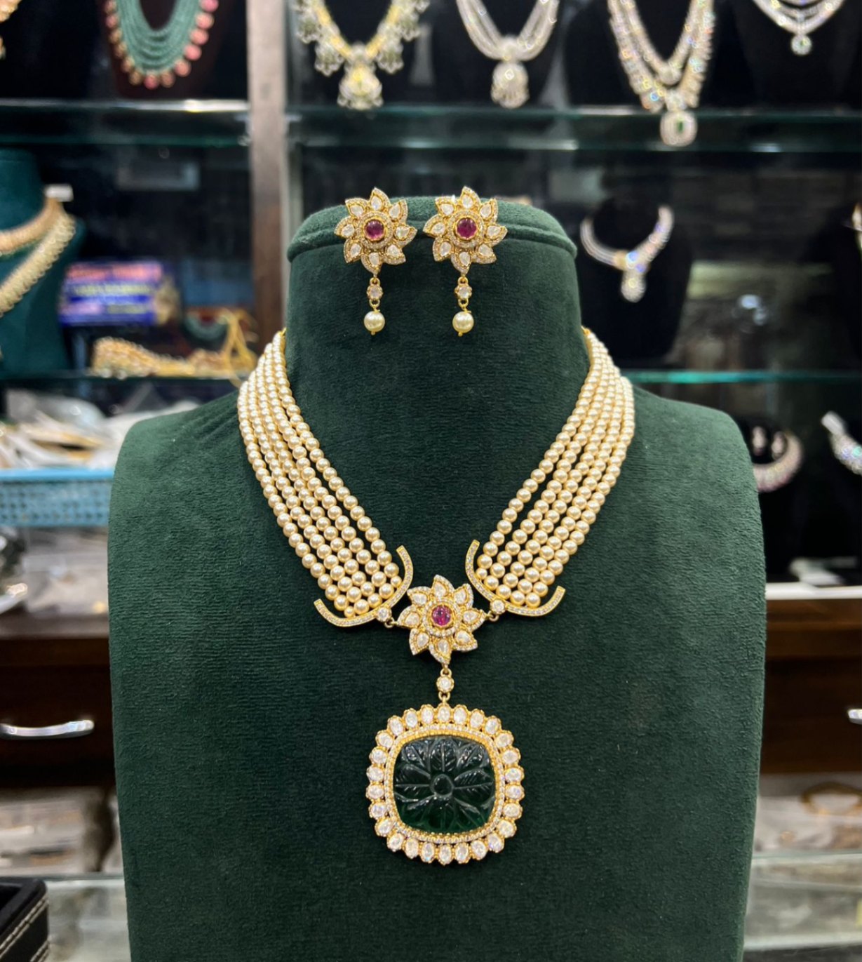 This premium quality NECKLACE necklace features Cz and Mozonite stones, Swarovski pearls, and push back earrings. With 3/4 length and multi color design, it's a must-have for trendy fashionistas. A hot seller for an elegant and stylish look.