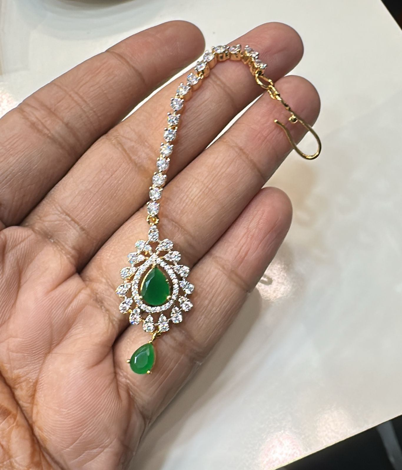 This elegant head tikka features a diamond-look design with sparkling CZ stones, enhanced by a sophisticated dual-tone polish. Its small size makes it a perfect accessory to add a subtle yet striking touch to your traditional or contemporary look. Ideal for special occasions, this piece combines timeless charm with modern style.