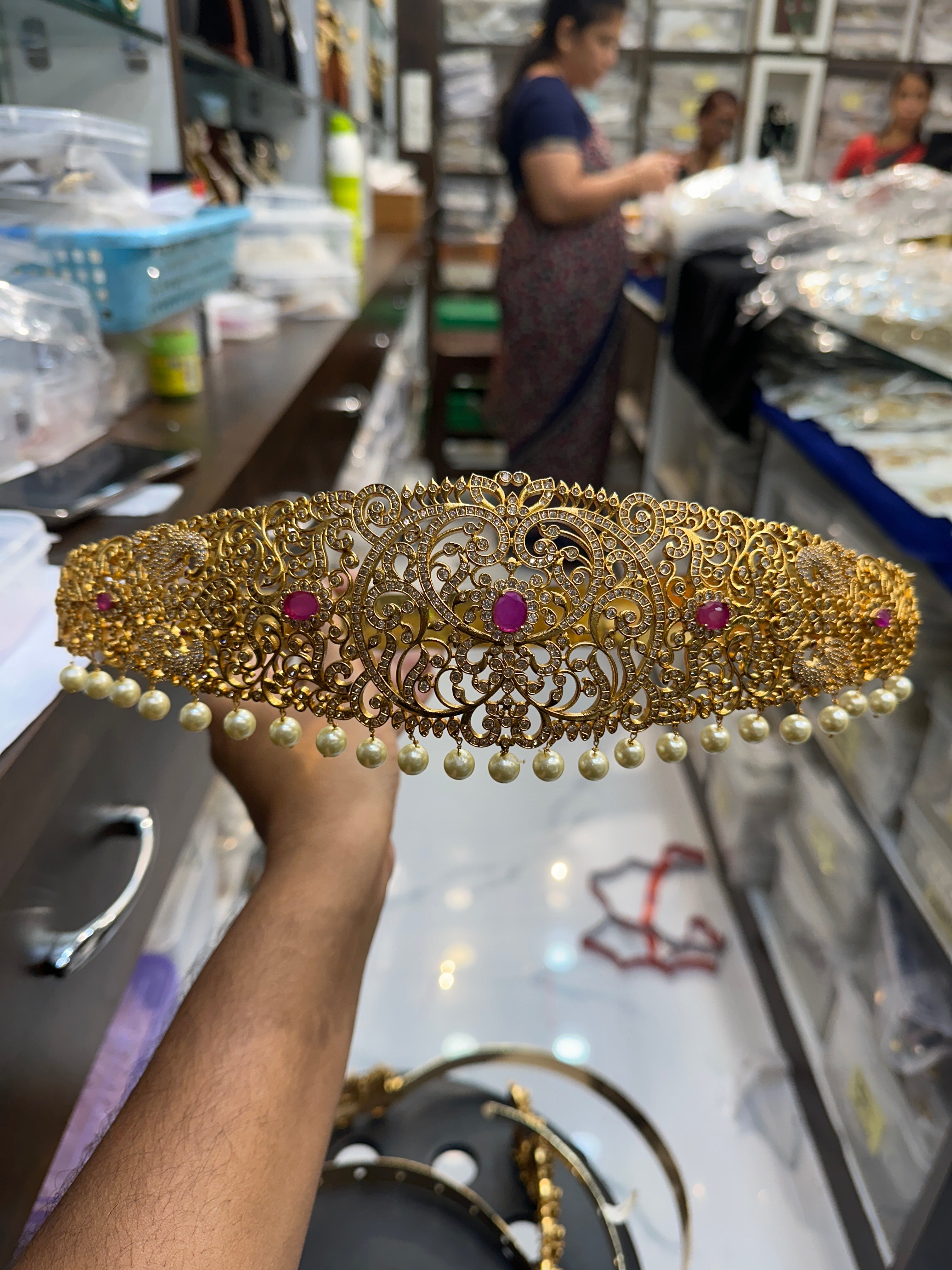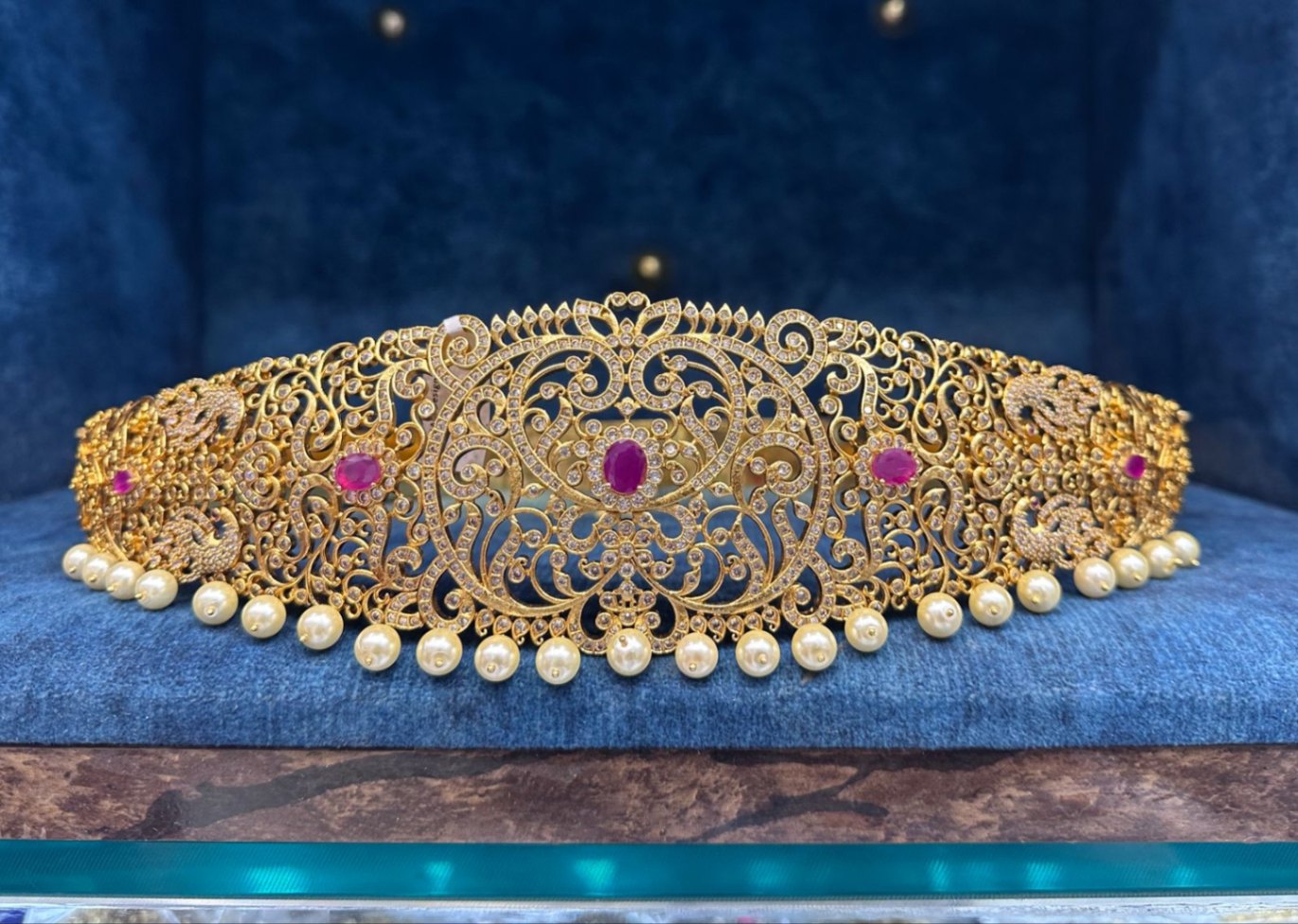 Introducing VA-WB047-1-MA-RU, the perfect accessory for any sophisticated adult. Featuring antique matte finish, stunning ad stone and pearl drops, and intricate peacock designs, this premium quality piece is a must-have for anyone looking to stay on trend. Elevate your style with this latest addition to your wardrobe.