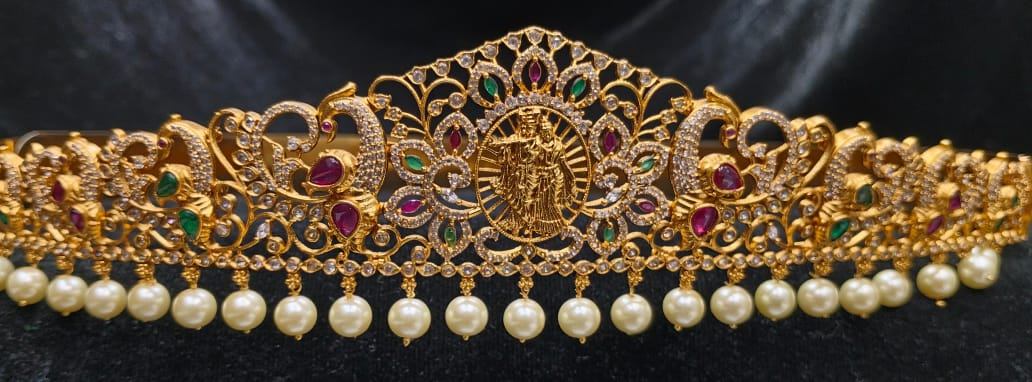 This traditional VA-WB099-1-MA-MU waist belt features a beautiful Radha krishna design with a South Indian twist. With a waist size of 34-40 inches, it is the latest and most trending accessory to elevate any outfit. The pearl drops add a touch of elegance to complete your look.