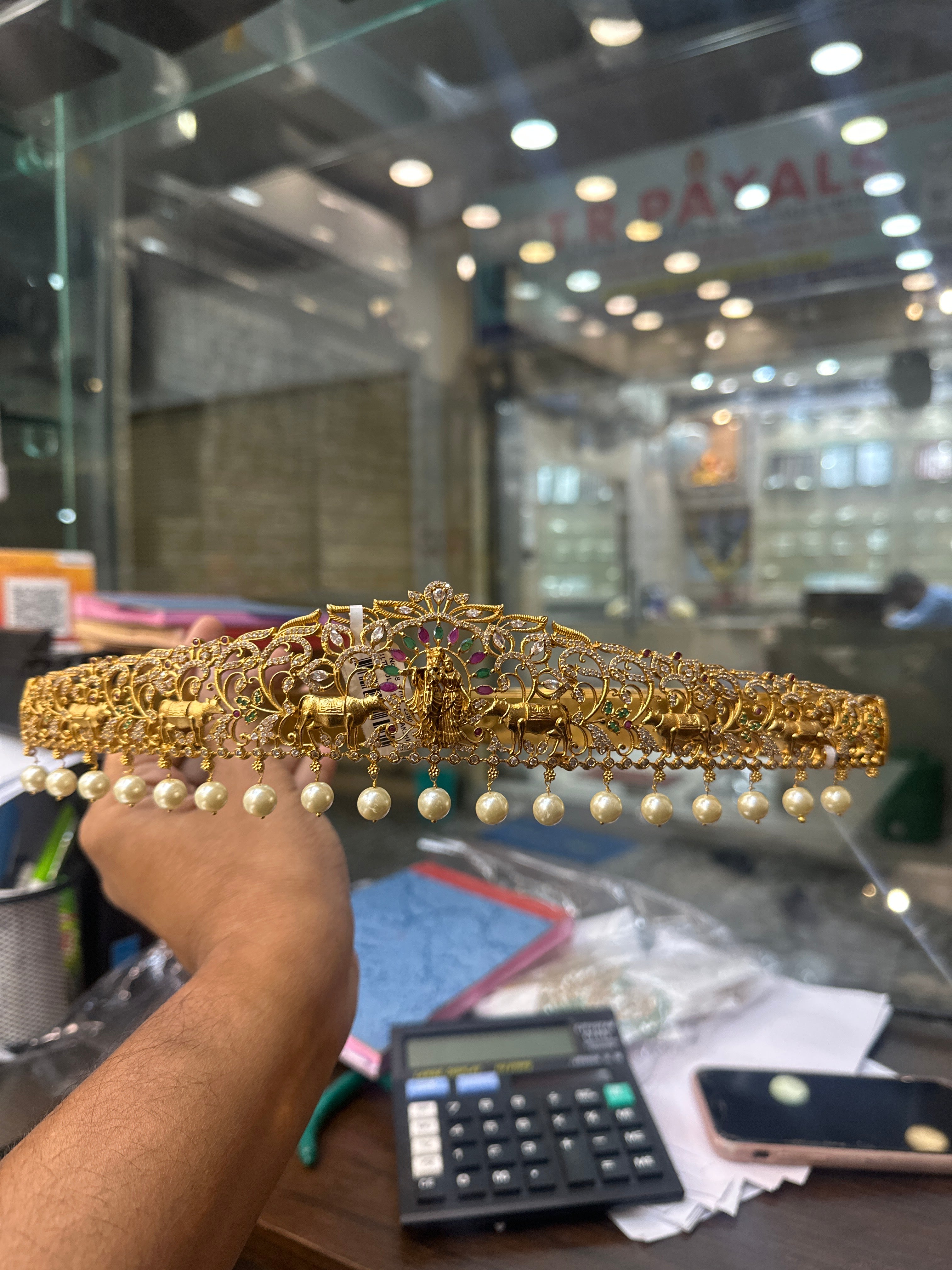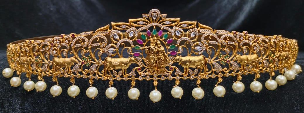 Expertly crafted with a Radha Krishna design and cow motif, this VA-WB100-1-MA-MU bracelet features stunning multi-color stones and delicate pearl drops. It's a perfect blend of the latest fashion and traditional South Indian style, comfortably fitting up to a 33 -40 inch waist size