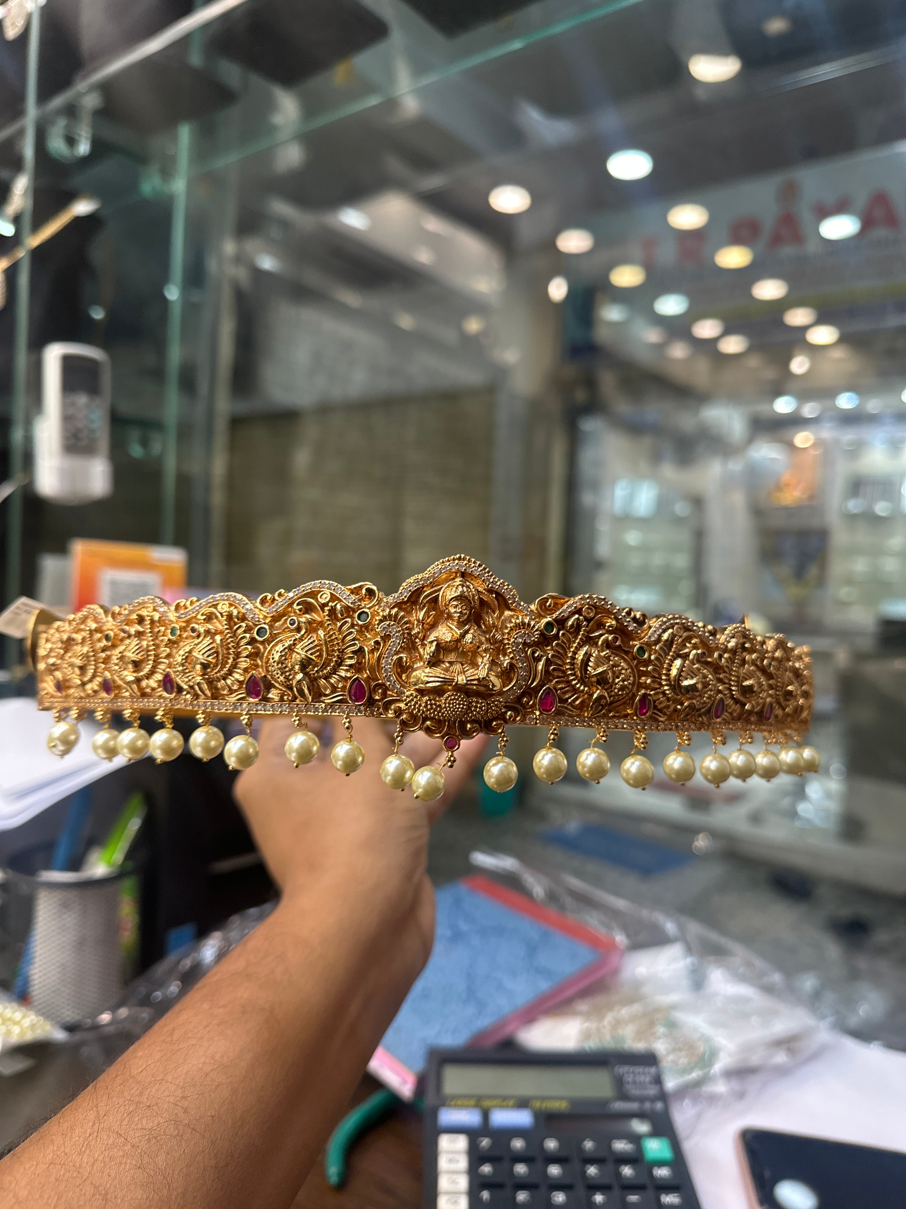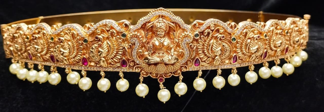 Expertly crafted with traditional Nakshi work, this waist belt features stunning peacock and goddess Laxmi motifs. The South Indian style and antique gold plating add a touch of elegance to any outfit. Fits waist sizes 33-40 inches. Elevate your look with the latest in ethnic fashion.