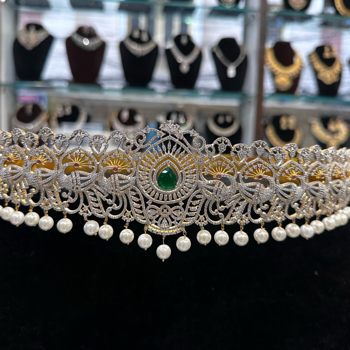 This VADDANAM WB060 DIAMOND EMERALD features an adult size peacock design with Cz stone and diamond-look accents. The pearls drops belt adds an elegant touch, making it perfect for weddings and festivals. Expertly crafted with stunning details, this piece is sure to impress.