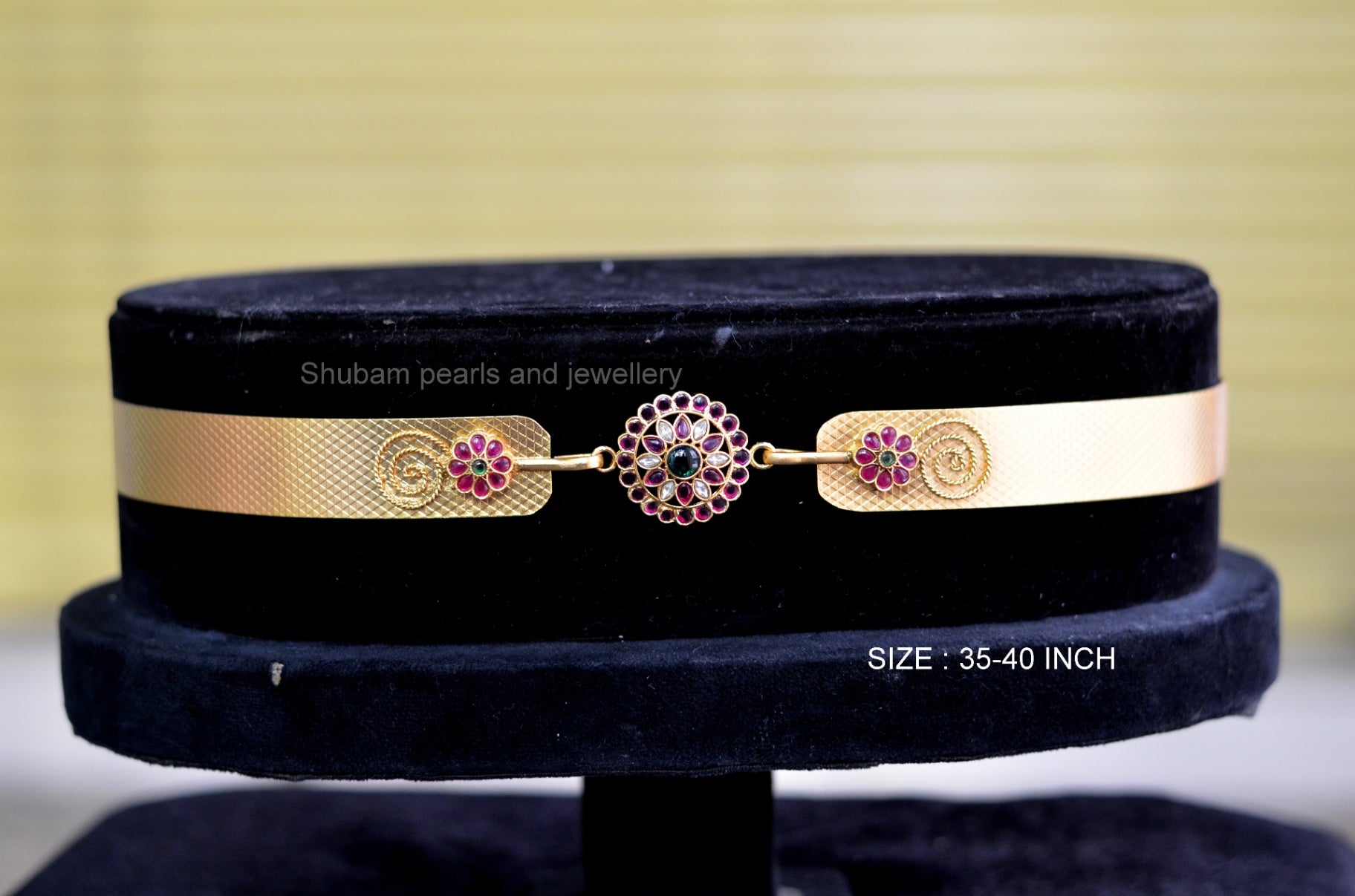 Expertly crafted for adults, the VADDANAM WB109 KEMPu GOLDEN brings a touch of traditional elegance to any outfit. The Jadau design and Kempu stones add a regal look, while the golden polish brass metal provides a timeless finish. With an adjustable size of 35-44 inches, this belt is the perfect addition to your wardrobe.